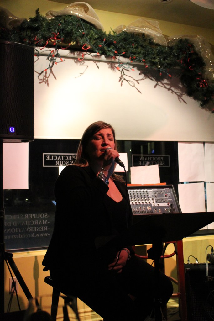 Une vingtaine de personnes (les 3/4 des places disponibles!) ont assisté à Des Airs de Jazz, le spectacle présenté par la chanteuse et l’accordéoniste. Des pièces françaises, Zaz, Montand, Legrand; des standards américains, Rodgers & Hart, Wonder, Sting; ainsi que des pièces québécoises, Lavoie, Lelièvre étaient au menu de ce souper-spectacle.
