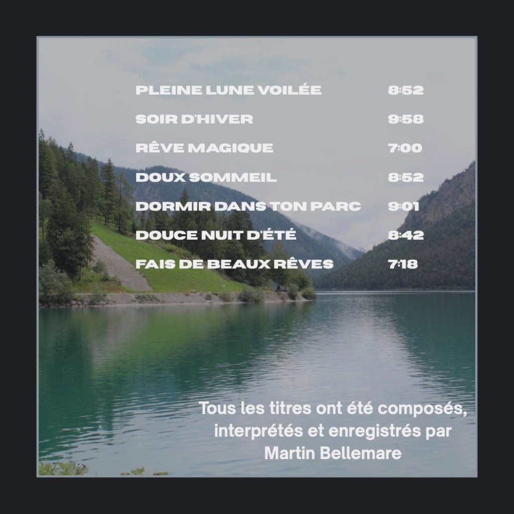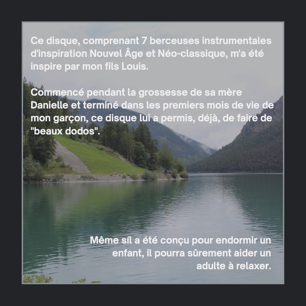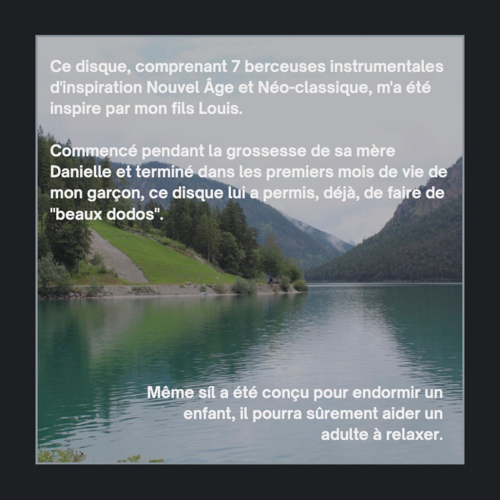 Après quelques années de pause, me revoici avec un nouvel opus à proposer. Il s’agit d’un CD de berceuses, d’abord créé en 2000 pour la naissance de mon fils Louis, puis révisé en 2025 avec un gros changement sonore. À l’origine, il a été créé avec synthétiseur dans un esprit Nouvel âge. Cette fois-ci , c’est en mode néo-classique, avec des sons d’instruments classiques (échantillonnés) que je vous propose ces pièces pour relaxer, pour endormir un enfant (ou un éternel enfant!!) ou comme musique d’ambiance pour travailler, pour s’inspirer ou toute autre bonne raison!!